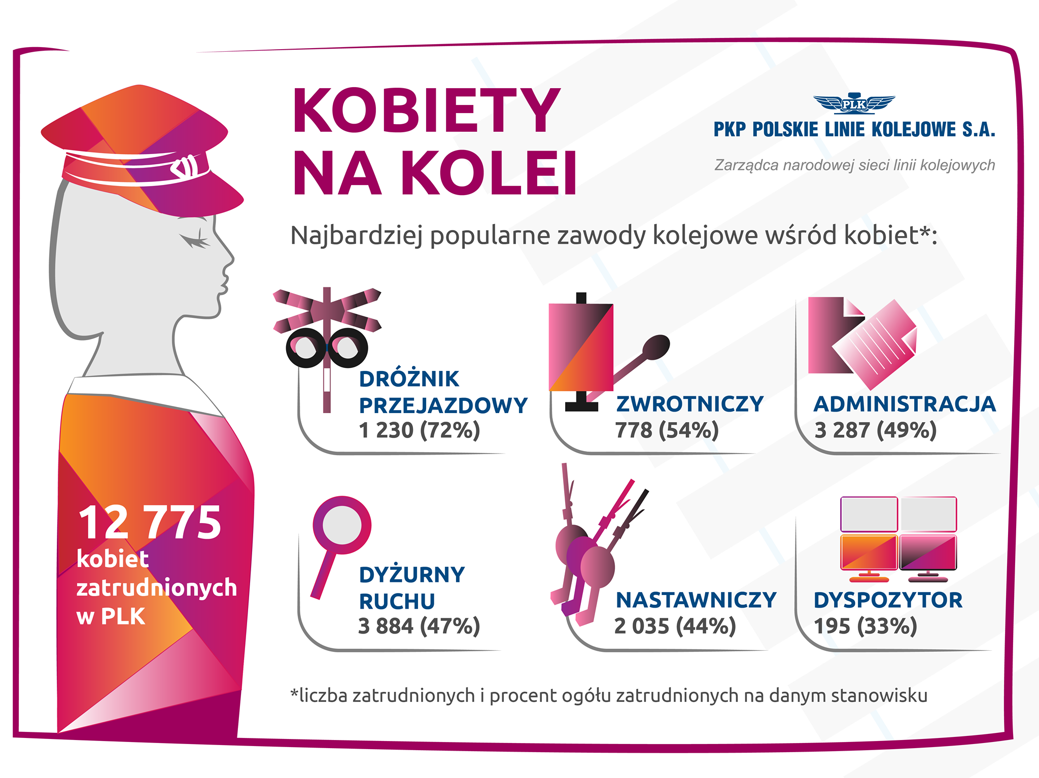 PKP Polskie Linie Kolejowe zatrudniają 12 755 kobiet. Najwięcej z nich, bo 1230 pracuje na stanowisku dróżniczki, a jest to 72% ogółu wszystkich zatrudnionych osób na tym stanowisku.