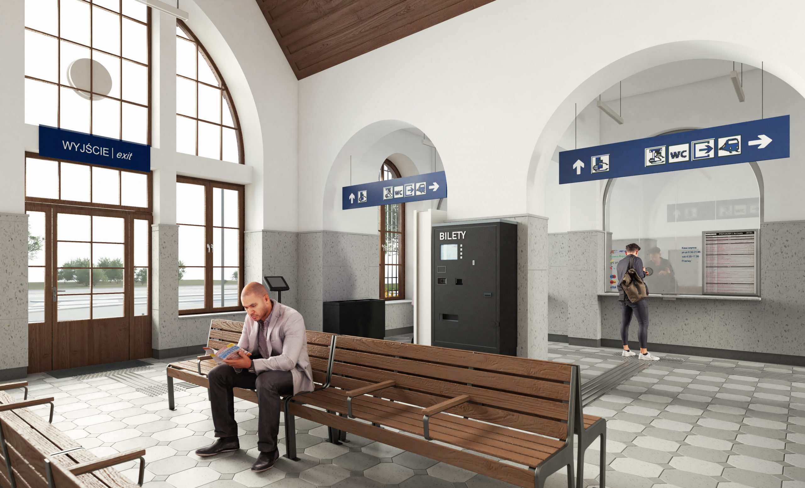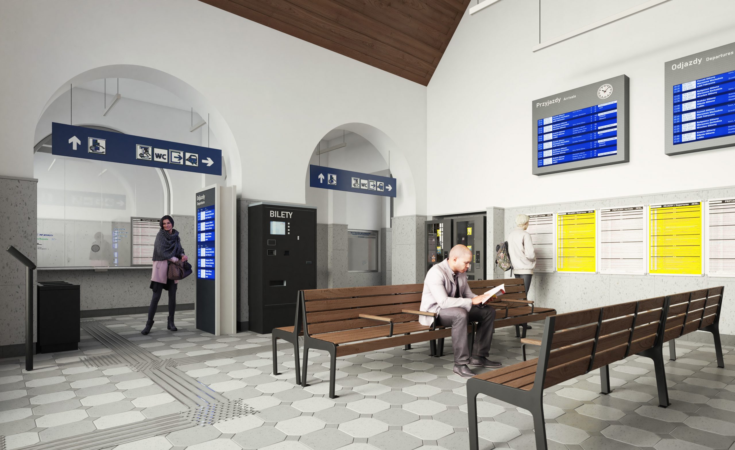 Modernizacja dworca oznacza również zmiany wewnątrz budynku. Na jego parterze zaprojektowano hol pełniący funkcję poczekalni. Dzięki inwestycji zyska on całkowicie nowe wyposażenie, czyli ławki, gabloty z rozkładami jazdy pociągów, elektroniczne tablice przyjazdów i odjazdów pociągów oraz nowy system informacji głosowej. W sąsiedztwie holu, oprócz pomieszczenia kas biletowych i toalet, zaplanowano przestrzeń pod przyszły lokal gastronomiczny oraz pomieszczenia biurowe przeznaczone dla jednej ze spółek kolejowych.
