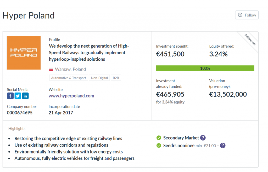 Pod koniec lutego Hyper Poland, firma założona m.in. przez absolwentów Politechniki Warszawskiej, wystartowała z drugą rundą crowdfundingu udziałowego na brytyjskiej platformie Seedrs. Jej celem było zebranie 451 tysięcy euro na dalsze testy oraz rozwój kolei najnowszej generacji, opartej o lewitację magnetyczną i silnik liniowy, poruszającej się na istniejących torach kolejowych z prędkością do 415 km/h.