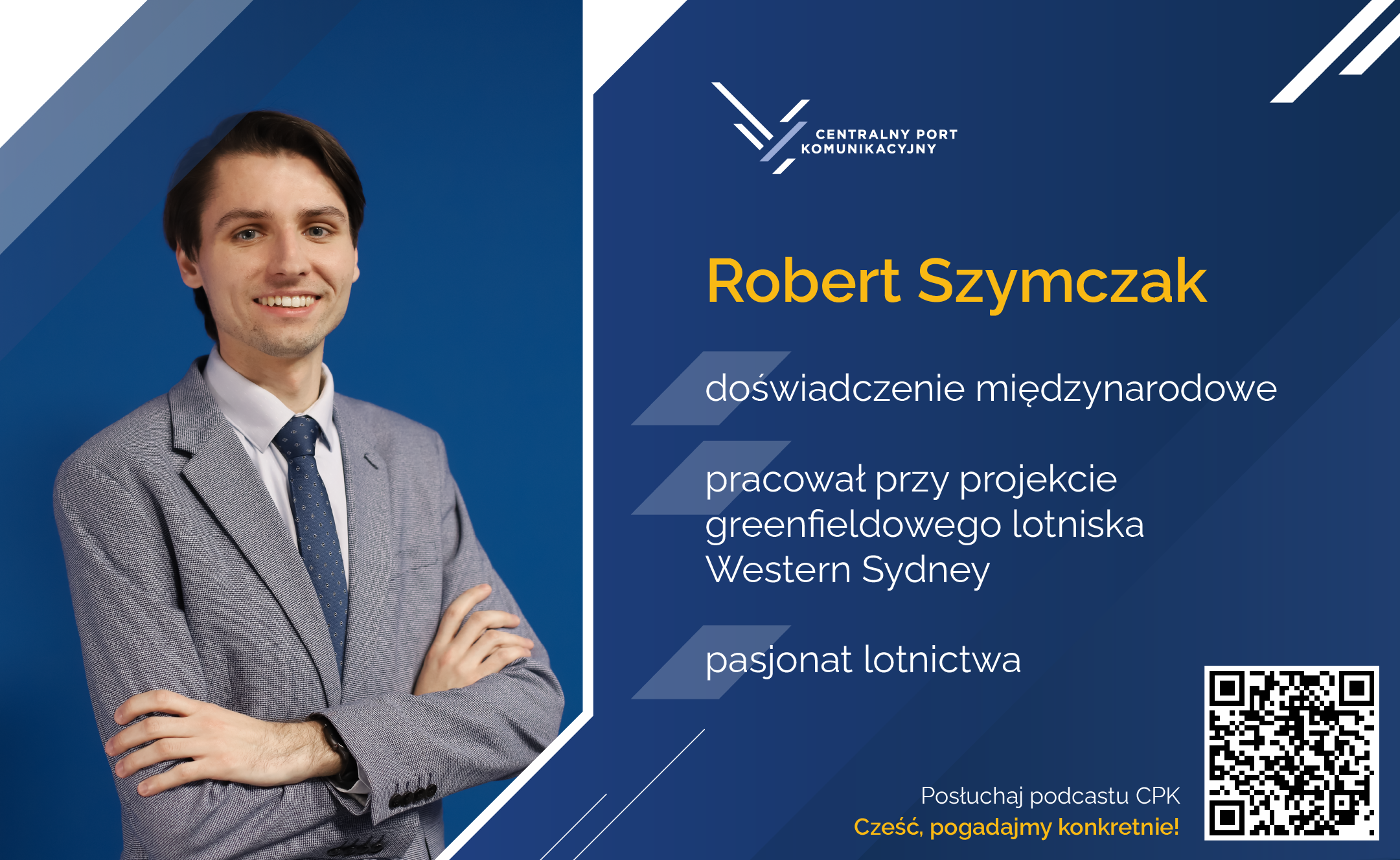 Razem z nim przy tworzeniu Master Planu pracuje m.in. Robert Szymczak, który specjalizuje się w tematach związanych z prognozami ruchu, przepustowością czy analizami symulacyjnymi. Robert posiada międzynarodowe doświadczenie w planowaniu rozwoju portów lotniczych. W przeszłości pracował między innymi przy projekcie greenfieldowego lotniska Western Sydney o przepustowości 80 mln pasażerów rocznie, a także przy koncepcji rozbudowy lotniska Harbin Taiping do układu z 4 drogami startowymi o łącznej przepustowości 100 mln pasażerów rocznie. Poza pracą zawodową, Robert realizuje swoją pasję do lotnictwa przez fotografowanie samolotów (tzw. plane spotting), a także pracę naukową na Politechnice Warszawskiej.