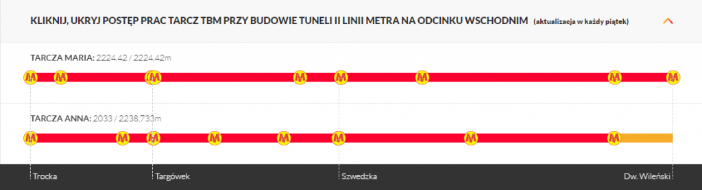 Dodatkowo na bieżąco można śledzić Dziennik Budowy odcinka północnego i zachodniego pod linkami: http://www.metro.waw.pl/dziennik-budowy-odcinek-wschodni-polnocny oraz http://www.metro.waw.pl/ii-linia-metra-109/dziennik-budowy-odcinek-zachodni
