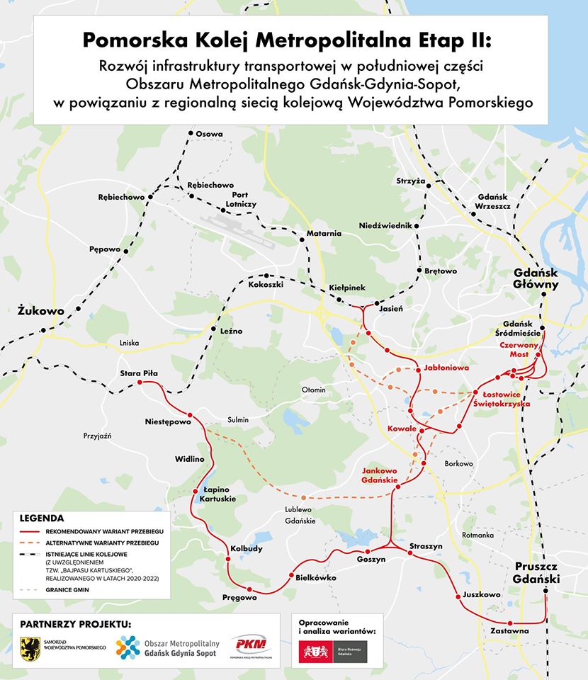 Analiza przygotowana przez Biuro Rozwoju Gdańska zakłada trzy różne warianty przebiegu linii kolejowej. Pomiędzy linią Gdańsk – Tczew a pętlą Łostowice Świętokrzyska wszystkie przebiegają tak samo. Potem jednak rozważane są trzy trasy. Jedna miałaby prowadzić w kierunku linii Pomorskiej Kolei Metropolitalnej w okolice przystanków Jasień i Kiełpinek. Natomiast drugi wariant zakłada połączenie z linią kolejową 229 (Kolej Doliny Raduni) w Straszynie w kierunku Kolbud – czytamy w opracowaniu BRG. Trzeci wariant to skierowanie trasy w Straszynie w stronę Pruszcza Gdańskiego.