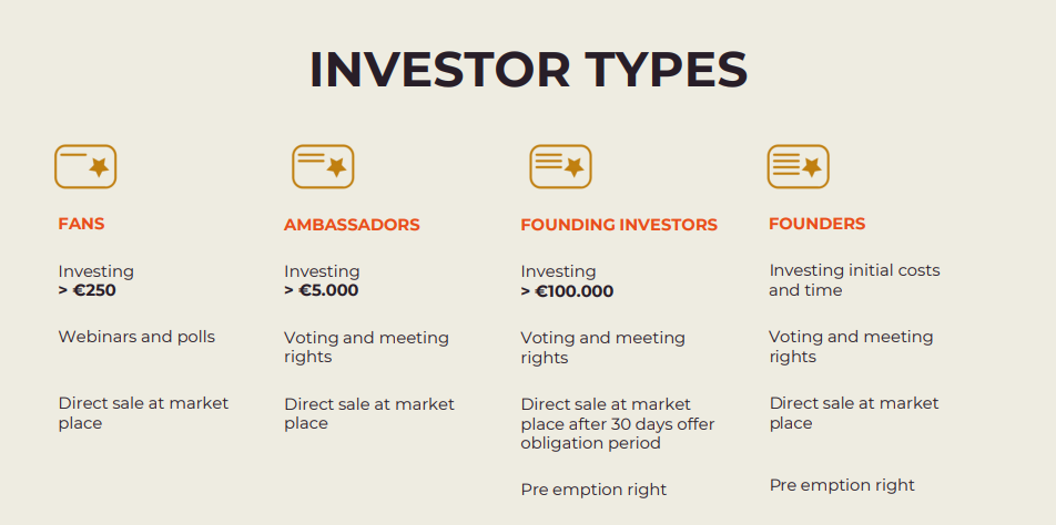 W zależności od kwoty, inwestorów czekają różne uprawnienia. Dla tych wpłacających co najmniej 5 tysięcy dolarów jest zapewniony głos podczas spotkań Zarządu. Natomiast dla tych co zdecydowaliby się zainwestować 100 tysięcy euro – obowiązuje prawo pierwokupu, czyli tacy akcjonariusze jako pierwsi będą mogli zakupić nowe udziały w spółce, gdy tylko będą dostępne.