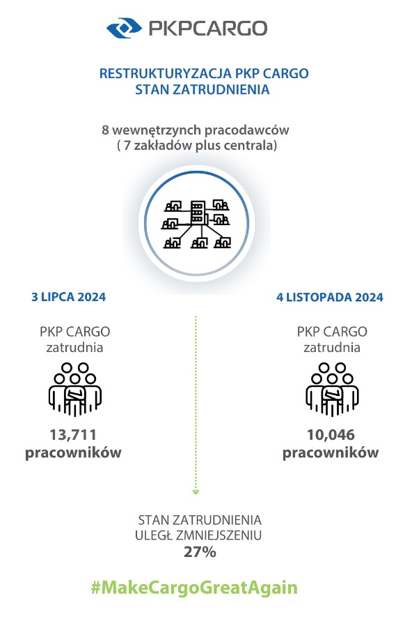 Gdy razem z pozostałymi członkami obecnego Zarządu objęliśmy swoje funkcje w kwietniu 2024 roku w PKP CARGO było zatrudnionych blisko 14 tysięcy pracowników. Szybko postawiliśmy diagnozę, że Spółka jest przeetatyzowana i firma, którą pozostawili nam poprzednicy nie posiada po prostu pracy dla tylu osób. Błędne zarządzanie i bierność poprzednich zarządów w pozyskiwaniu kontraktów m.in. na rok 2024, a także obecna i prognozowana na najbliższe lata sytuacja na rynku przewozów towarowych zmusiły nas do podjęcia tych niezwykle trudnych decyzji i przeprowadzenia zwolnień grupowych. Naszym celem było uratowanie ponad 10 000 potrzebnych miejsc pracy – dr Marcin Wojewódka, p.o. Prezes Zarządu PKP CARGO S.A. w restrukturyzacji.