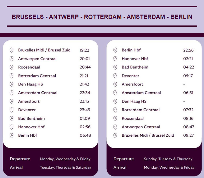 Podróż w pełnej relacji ma zająć około 11,5 godziny. Z Brukseli pociąg ma wyjeżdżać o godzinie 19:22, by do Berlina dojechać o 6:48, w drogę powrotną ma wyruszać o 22:56, by w Brukseli znaleźć się o godzinie 9:27. Z Brukseli pociągi mają odjeżdżać w poniedziałki, środy i piątki, z Berlina natomiast w niedziele, wtorki i czwartki.