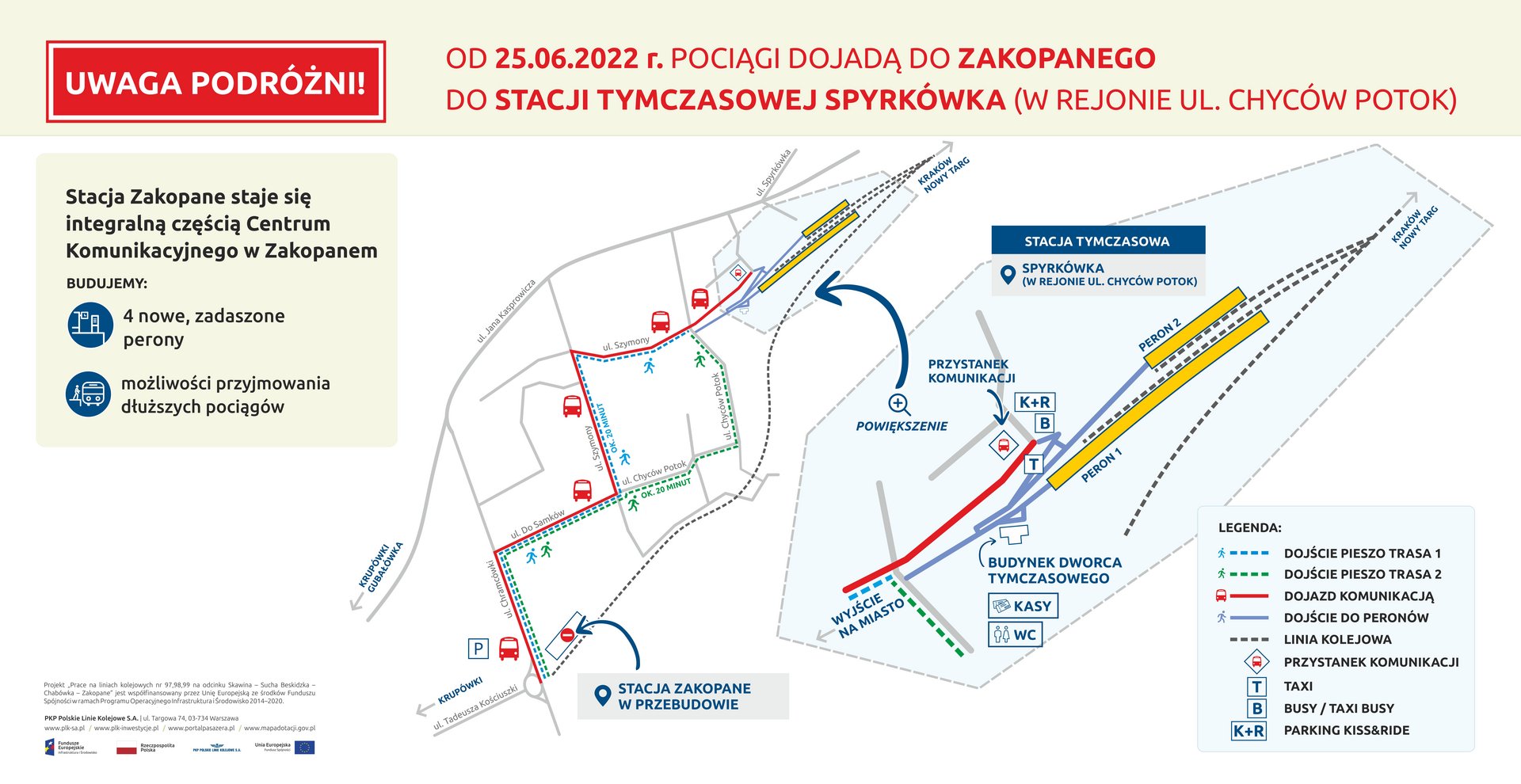 Stacja kolejowa Zakopane jest w przebudowie. Dla podróżnych przygotowana jest tymczasowa stacja w Zakopanem, na Spyrkówce – w rejonie ul. Chyców Potok. Pasażerowie będą mogli korzystać z tego miejsca, podobnie jak w wakacje – dodaje Dorota Szalacha.