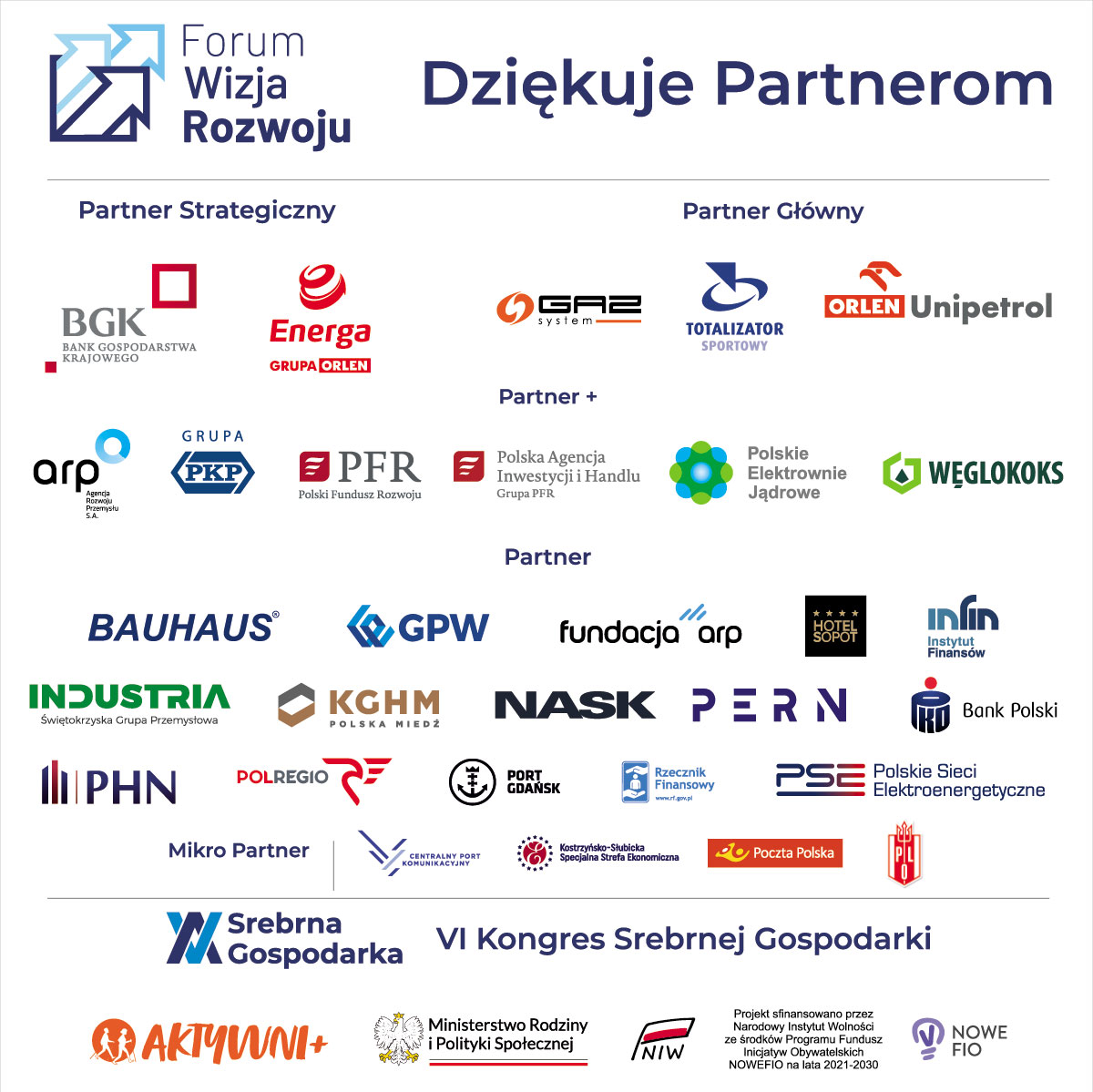 Patronat honorowy nad VI Forum Wizja Rozwoju objął Premier RP Mateusz Morawiecki. Partnerem Strategicznym wydarzenia jest Bank Gospodarstwa Krajowego oraz ENERGA Grupa ORLEN. Partnerami Głównymi są: Totalizator Sportowy Sp. z o.o., Operator Gazociągów Przesyłowych GAZ-SYSTEM S.A. oraz ORLEN Unipetrol RPA s.r.o. Partnerem+ jest Agencja Rozwoju Przemysłu S..A., Polskie Koleje Państwowe S.A., Polski Fundusz Rozwoju S.A., Węglokoks S.A., Polskie Elektrownie Jądrowe Sp. z o.o. oraz Polska Agencja Inwestycji i Handlu S.A. Partnerami są: KGHM Polska Miedź S.A., Polski Holding Nieruchomości S.A., NASK, PERN S.A., PKO Bank Polski, Giełda Papierów Wartościowych w Warszawie S.A., Zarząd Morskiego Portu Gdańsk S.A., Rzecznik Finansowy, POLREGIO S.A., Świętokrzyska Grupa Przemysłowa INDUSTRIA S.A., Instytut Finansów, Polskie Sieci Elektroenergetyczne S.A., HOTEL SOPOT, Zarząd Morskiego Portu Gdynia S.A.. Mikro Partnerami są: Poczta Polska S.A., Centralny Port Komunikacyjny sp. z o.o., Kostrzyńsko-Słubicka Specjalna Strefa Ekonomiczna S.A. oraz Polskie Linie Oceaniczne S.A. Projekt dofinansowano ze środków Fundacji ARP.