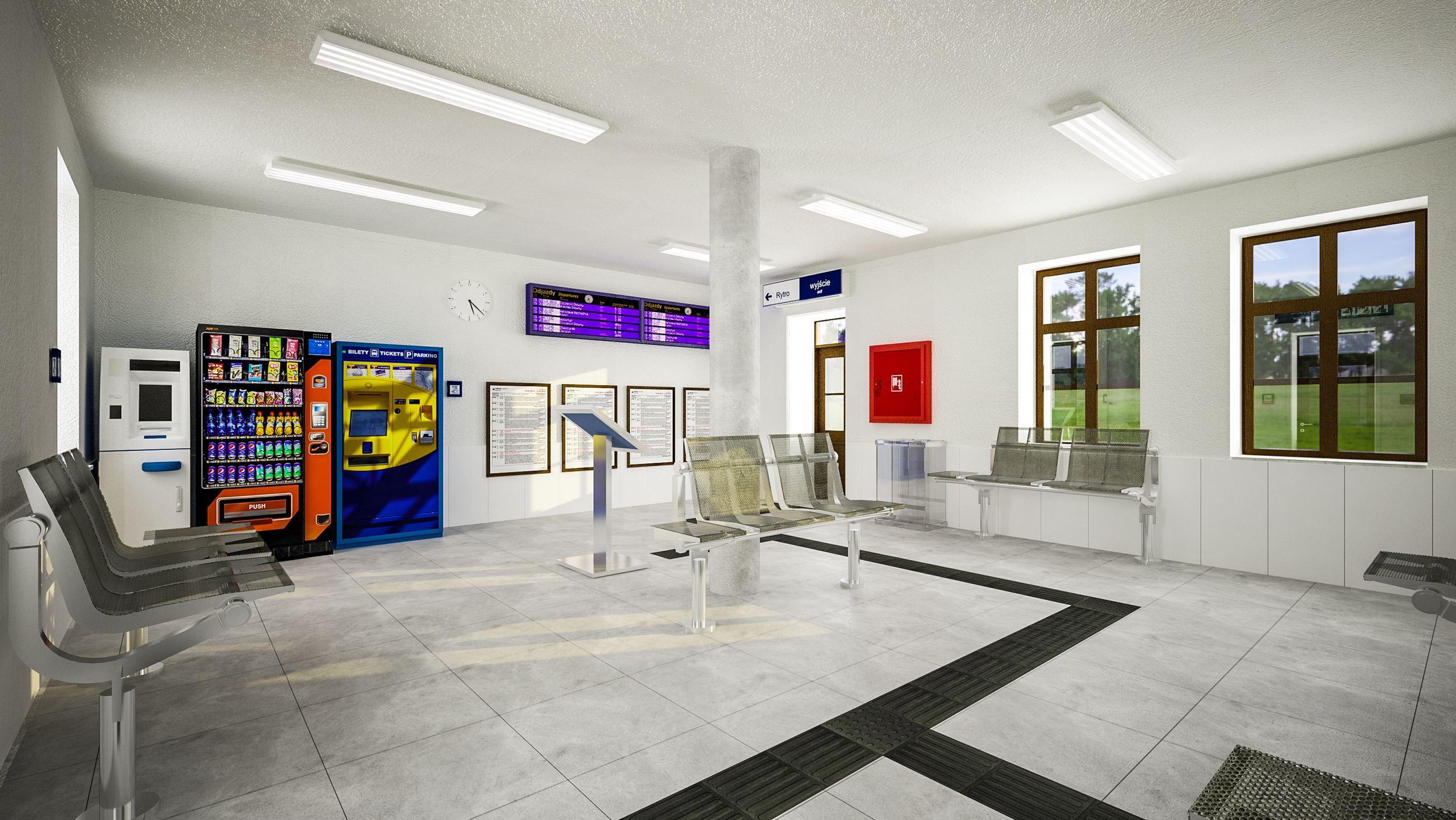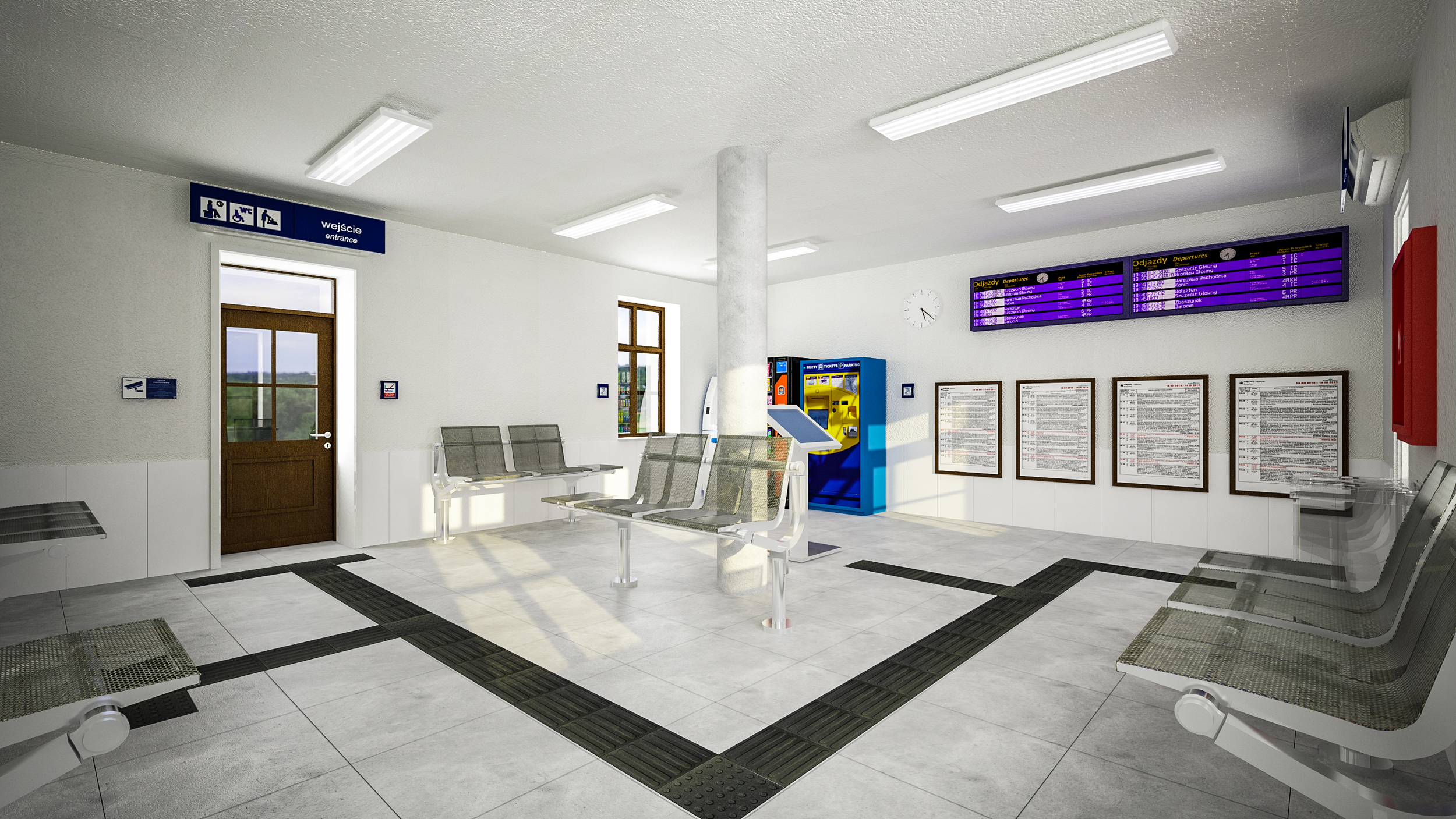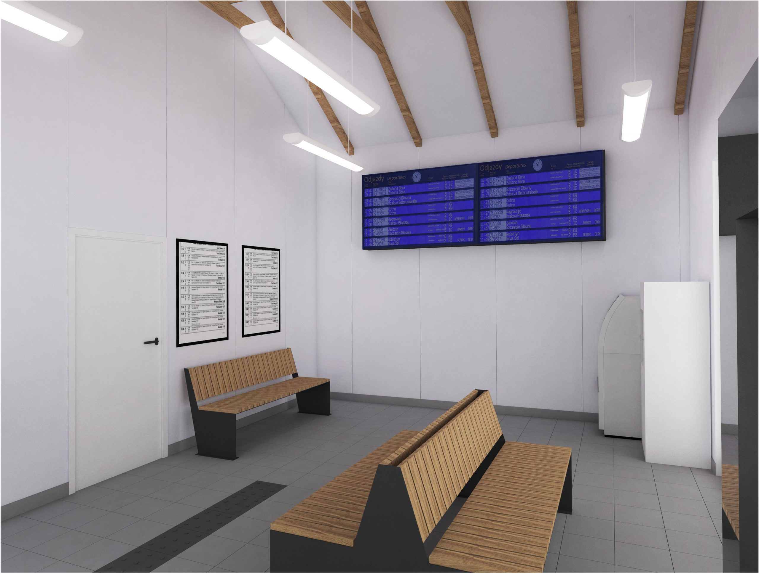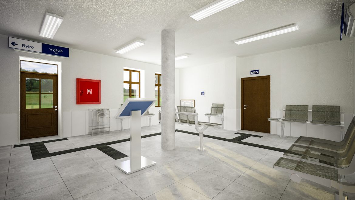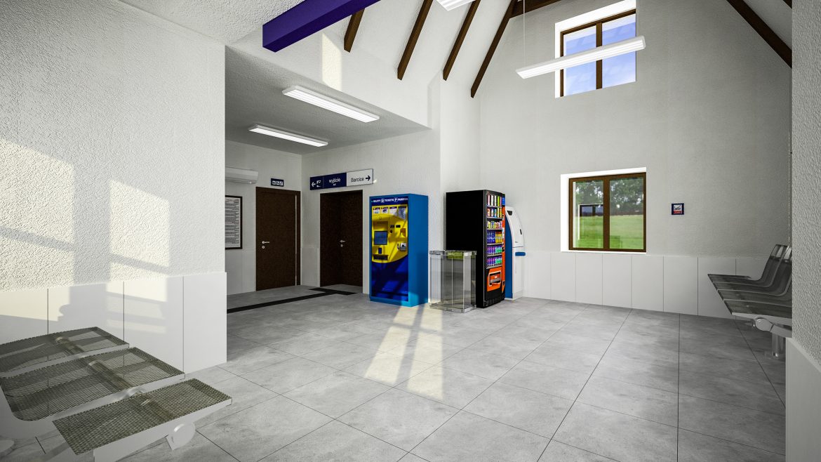Równie interesująco będzie prezentować się wnętrze dworca. Do dyspozycji podróżnych zaprojektowano poczekalnię o powierzchni około 30 m kw., w której część ścian została przeszklona, a pozostałe pomalowane na biało. Stanowią one tak pożądany w nowoczesnej architekturze kontrast dla szarej posadzki pomieszczenia. Dopełnienie aranżacji wnętrza stanowi sufit, gdzie zdecydowano się na wyeksponowanie delikatnie zdobionych krokwi. To posunięcie dodaje utrzymanemu w odcieniach bieli i szarości wnętrzu nieco ciepła. Poza inspirującym wystrojem w poczekalni podróżni znajdą ławki z miejscem na bagaż, gabloty z rozkładem jazdy, zegar, elektroniczne tablice przyjazdów i odjazdów pociągów. W jej sąsiedztwie zaprojektowano toalety.